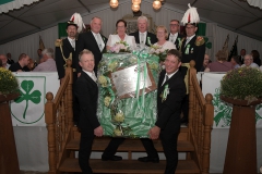 Dann war es an der Zeit auch noch zwei Verabschiedungen durchzuführen. Zuerst wurde Jürgen Overkamp und seine Frau Gabi auf die Bühne geben. Jürgen der dieses Jahr im Throngefolge war, hat bis zum letzten Jahr dem Schützenverein als Fahnenträger gedient. Ihm wurde noch einmal ein großer Dank für seine 12-jährige und hervorragende Arbeit als Fahnenoffizier ausgesprochen. Ein Dank ging auch an Gabi, die Jürgen die ganzen Jahre unterstützt hat.