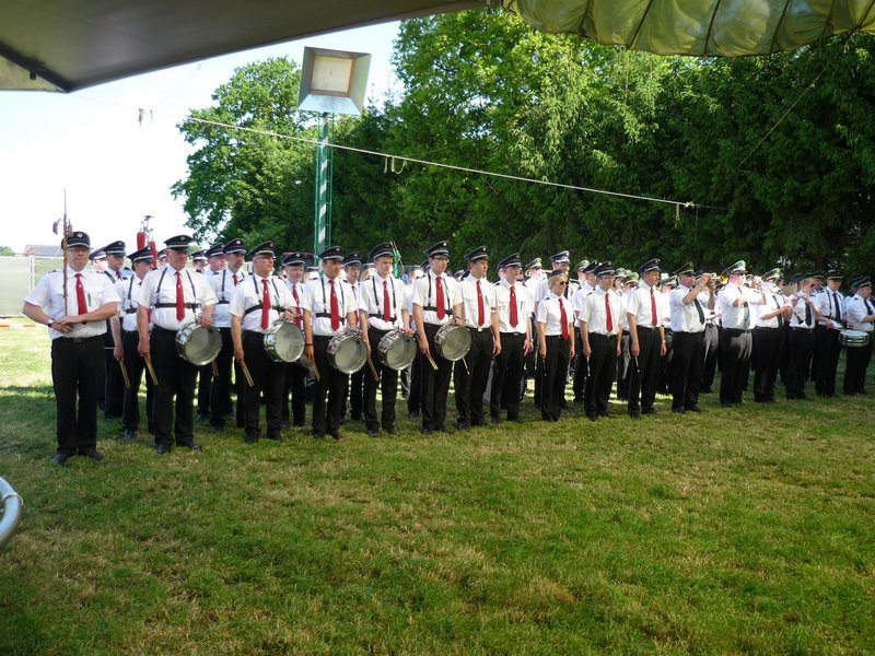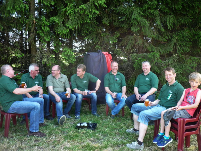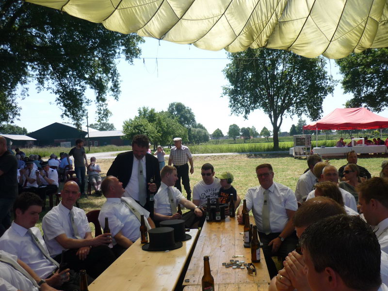 Bei über 30 Grad und guter Stimmung hat das Schießen an der Vogelstange im Wienkamp um 11.30 Uhr begonnen. Die motivierten Schützen sorgen dafür, dass bereits nach einer Stunde beide Flügel zu Boden geschossen sind Um der brütenden Hitze zu entkommen, sucht die Schützengesellschaft Schatten unter der runden aufgespannten Zeltplane, die stilecht an Traktoren befestigt ist. Da es an Königsanwärtern zunächst nicht mangelt und an der Würstchenbude und dem Getränkestand reger Betrieb herrscht, droht bei den rund 600 Gästen keine Langeweile aufzukommen. Musikalisch untermalt wird das Fest von der Musikkapelle Südlohn, die in der Nähe der Tannen einen Schattenplatz gefunden hat. Eine Gruppe junger Frauen hat sich, um zumindest den Füßen eine Abkühlung zu gönnen, kurzerhand ein Planschbecken besorgt.